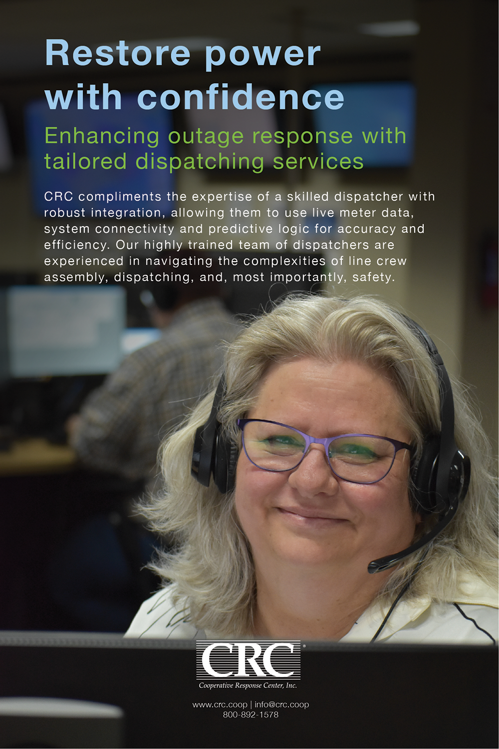 CRC offers utilities across the country seamless contact center and alarm monitoring solutions, including call management, line crew dispatch, AMI/CIS/OMS integration, CRCLink® outage communication software, and alarm monitoring. CRC also offers outage texting services, video monitoring of substations and a Payment Card Industry (PCI) compliance solution which utilizes live agents for billing calls. From outage calls to billing calls, disconnects to emergency locates and more, CRC is there for its membership 24/7/365. By partnering with CRC, members find peace of mind as well as a cost-effective solution to their call handling needs.